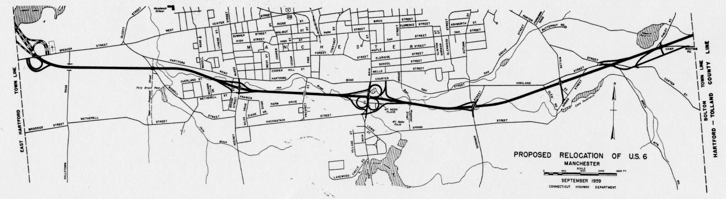 By the time a public hearing was held in October 1959, an alternative alignment north of Middle Turnpike had already been discarded, and the favored proposal was very close to the way I-384 was constructed in 1971. The interchanges at Spencer Street and South Main Street (Route 83) were revised, and the Gardner Street ramps (see 1959 plan (108K)) were instead built at Wyllys Street. The highway's path south of the business district and higher populated areas minimized the number of properties affected and served as a buffer between the city and the suburban areas further south.