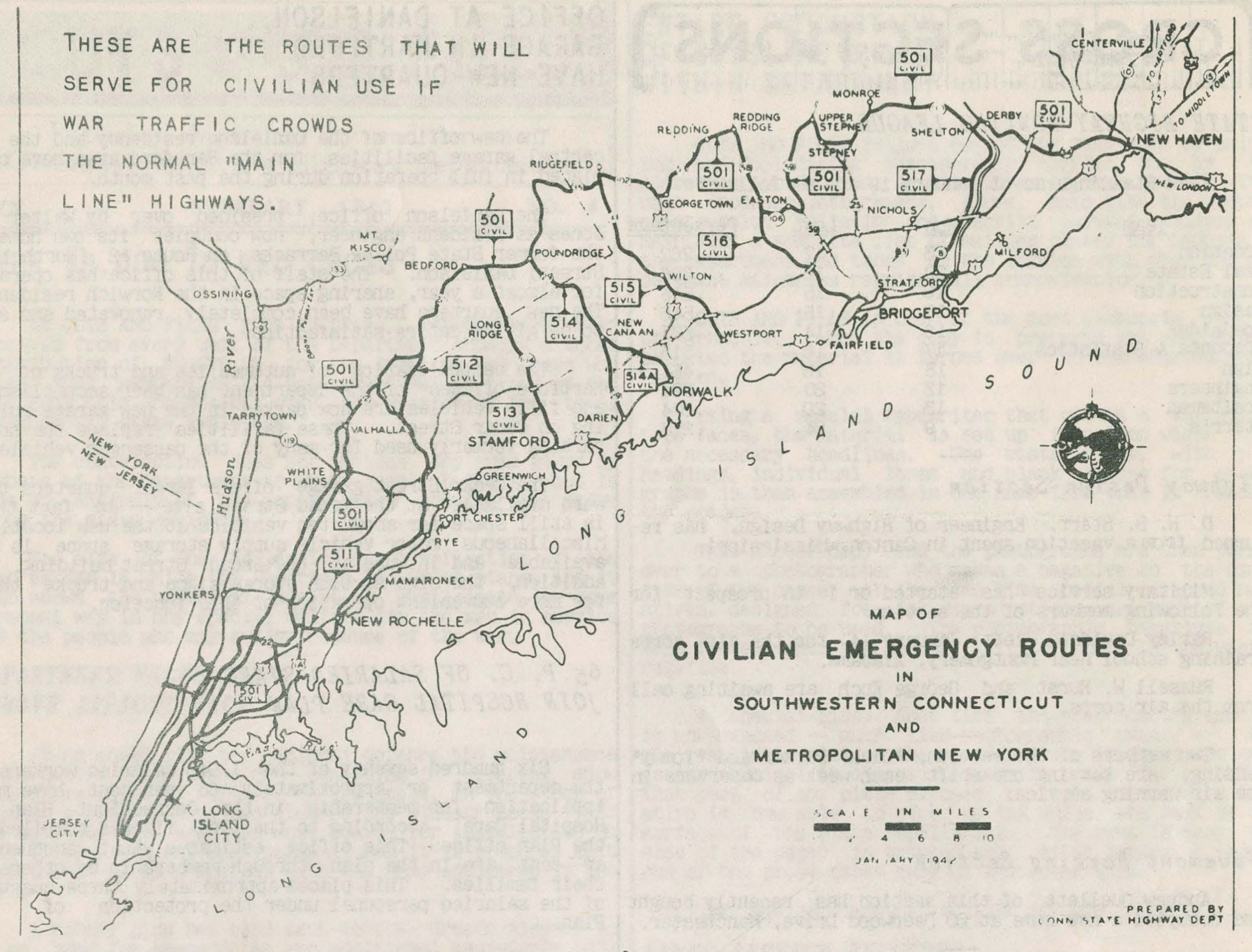 In February 1942, with the United States embroiled in World War II on two fronts, the New York-area Metropolitan Defense Transport Committee mapped out a network of secondary Civil Routes in case the main routes were required for military use. The Civil Routes would follow little-used secondary highways and city streets.