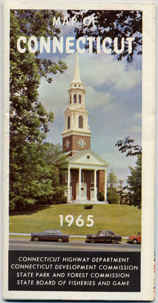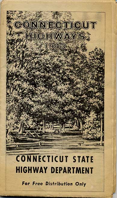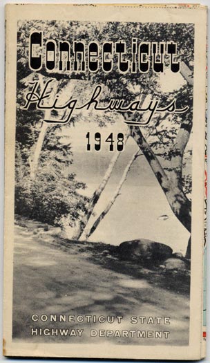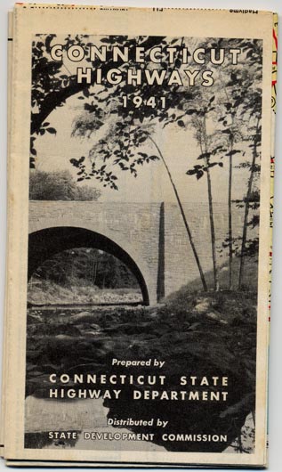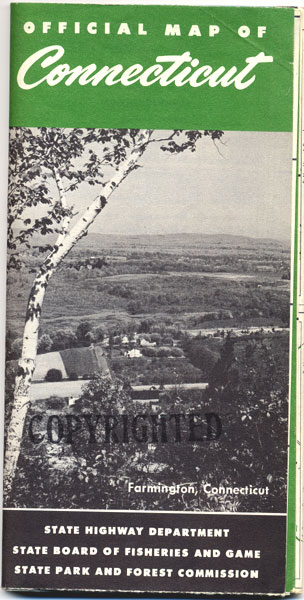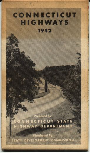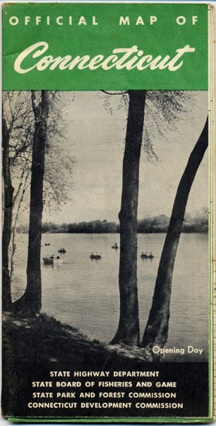 In 1941, the state issued its first two-sided map with city insets, based on a new road survey. The map folded into a much smaller area, and for the first time featured cover art, scenic photographs, and a strip map of the Merritt Parkway.