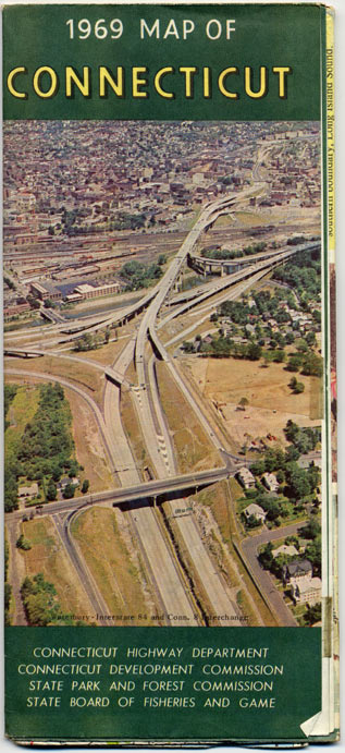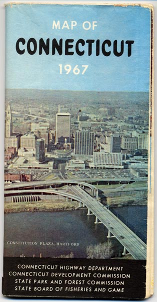 During the first few years, city insets were still placed on the reverse of the main map. In 1968, the map was made taller (9"), and city insets were moved to the front, surrounding the state map where Long Island Sound and Rhode Island would otherwise be. Very high-detail insets were added for the centers of Hartford, New Haven, and Waterbury. (See sample from 1975 map.) This general layout remains to this day.
