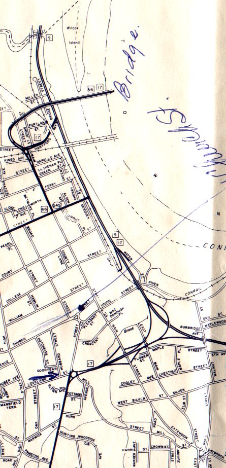 The News-Times story (see footnotes) reported that the mapmakers compounded the snub by omitting the yellow shading, which signifies an urban area, from Danbury. (This is not accurate; starting with the 1998 map, ConnDOT redefined the shading to indicate those areas shown in detail in an inset. Danbury's missing shading is consistent with the missing inset.)